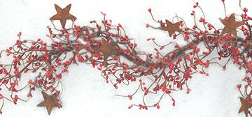 Add a touch of country to your mantle or shelf with a garland of burgundy pip berries with rusty stars. This Burgundy and Rusty Star Garland has pip berries with 2" rustic star accents on wire wrapped stems, so you can shape the garland easily. It is 40" long and for indoor use only. It would look great at the top of your kitchen cabinets.